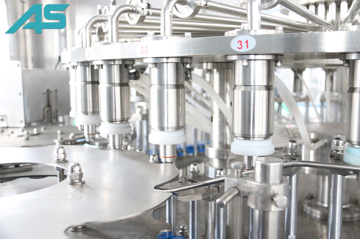 本設(shè)備是集沖瓶、灌裝、封口于一體,全自動系統(tǒng)由PLC可編程控制系統(tǒng)控制,觸摸屏操作,高速運轉(zhuǎn),其中臺面采用的是雙層臺面,臺面上的機器連接結(jié)構(gòu)降低重心,旋蓋頭的間距減低,同時在里面增加磁鐵數(shù),扭力均勻且可調(diào)節(jié)。另外旋蓋部分做成一體式,更加結(jié)實耐用。